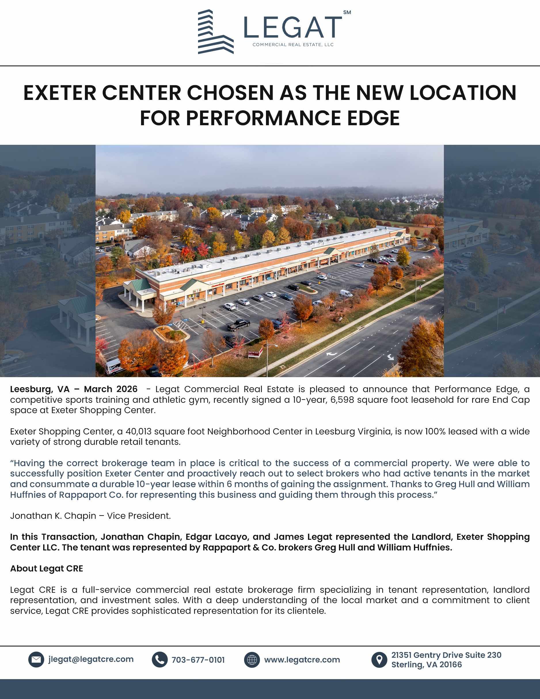 Leesburg, VA – March 2026 – Legat Commercial Real Estate is pleased to announce that Performance Edge, a competitive sports training and athletic gym, recently signed a 10-year, 6,598 square foot leasehold for rare End Cap space at Exeter Shopping Center.