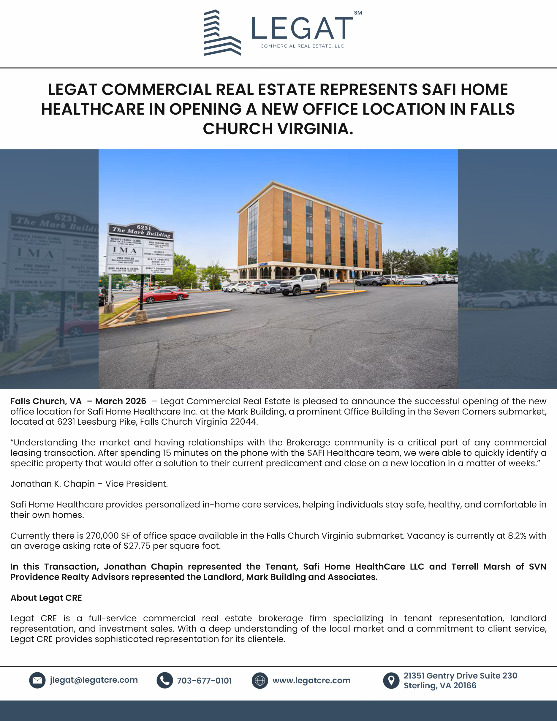 Falls Church, VA – March 2026 – Legat Commercial Real Estate is pleased to announce the successful opening of the new office location for Safi Home Healthcare Inc. at the Mark Building, a prominent Office Building in the Seven Corners submarket, located at 6231 Leesburg Pike, Falls Church Virginia 22044.